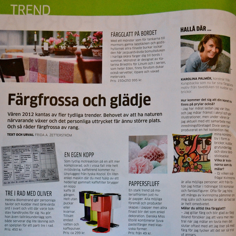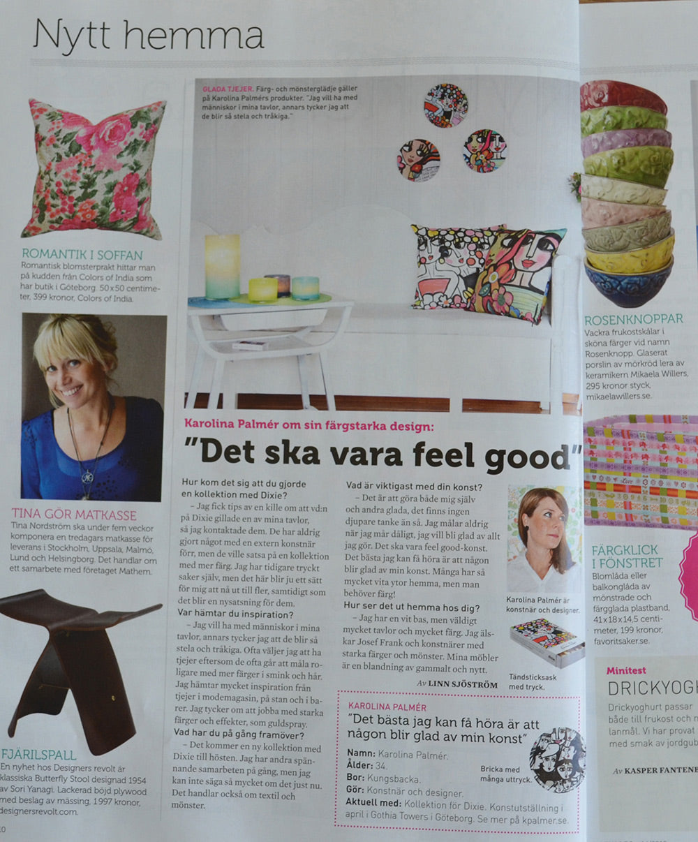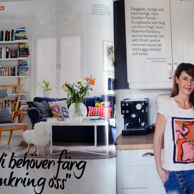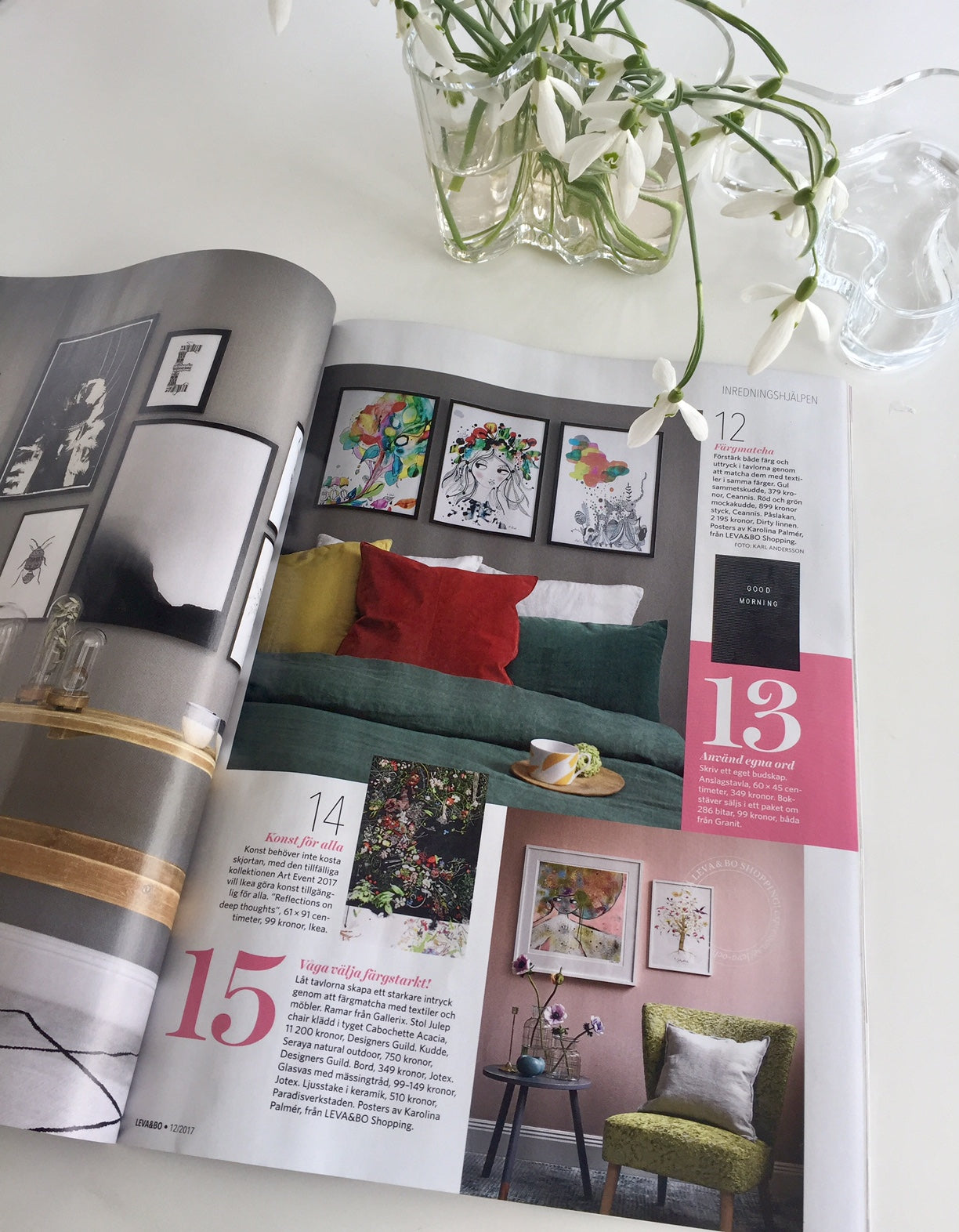 Mina färgglada motiv fick en helssida i Leva & Bo. Jag samarbetade med Bonniers NOA Gallery under de 6 år som galleriet fanns.
