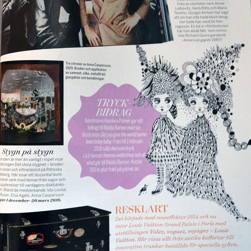 Min illustration "Did you give the world som love today" som såldes till förmån för Rädda Barnen. DV skev om detta.