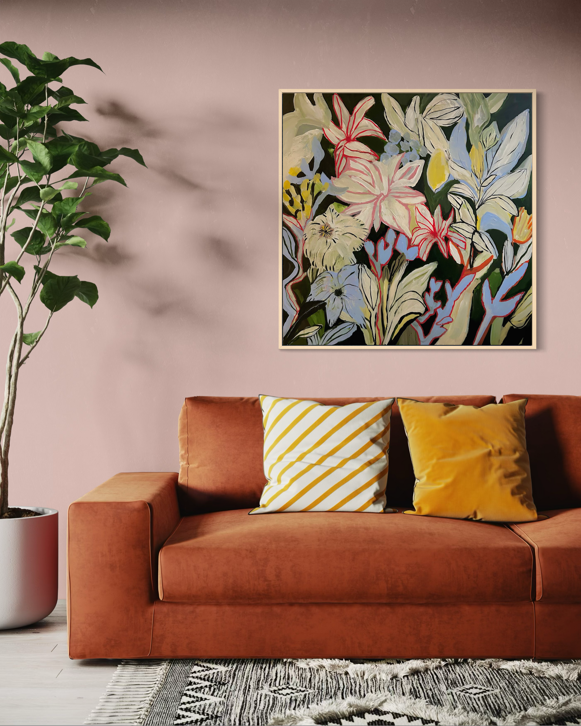 "Botanic Garden" är ett stort handmålat originalverk i akryl där starka färger och organiska former möts i en färgsprakande dynamik. Verket symboliserar växtkraft och energi – en målning som lyfter både moderna och klassiska hem.